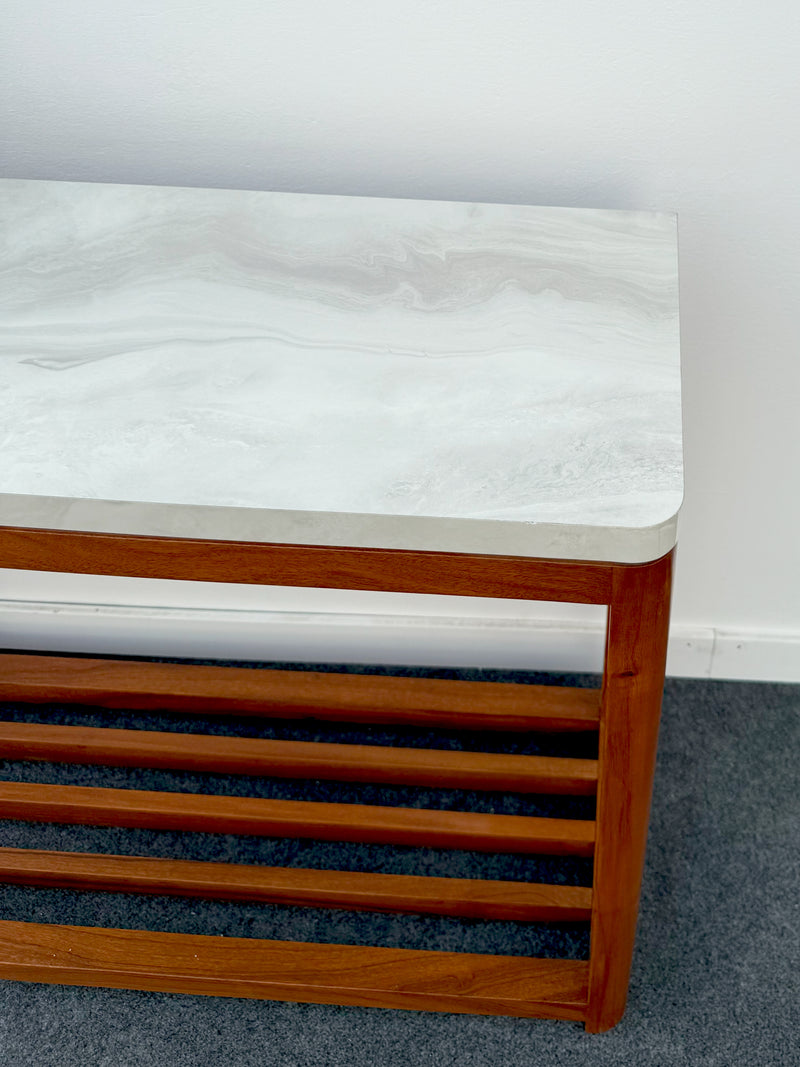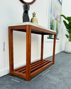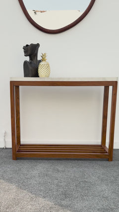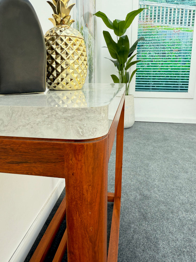 The Clean Silent Timber Hallway Table is a celebration of refined craftsmanship and minimalist design. Expertly handcrafted from solid Kikar hardwood, it features a smooth UV-sheet marble-effect top that adds a touch of sophistication.