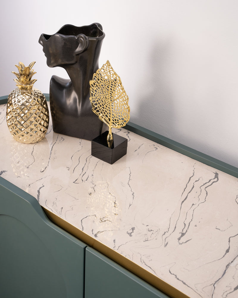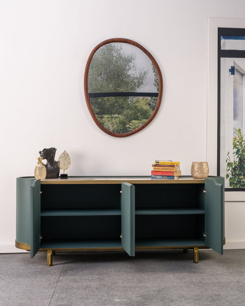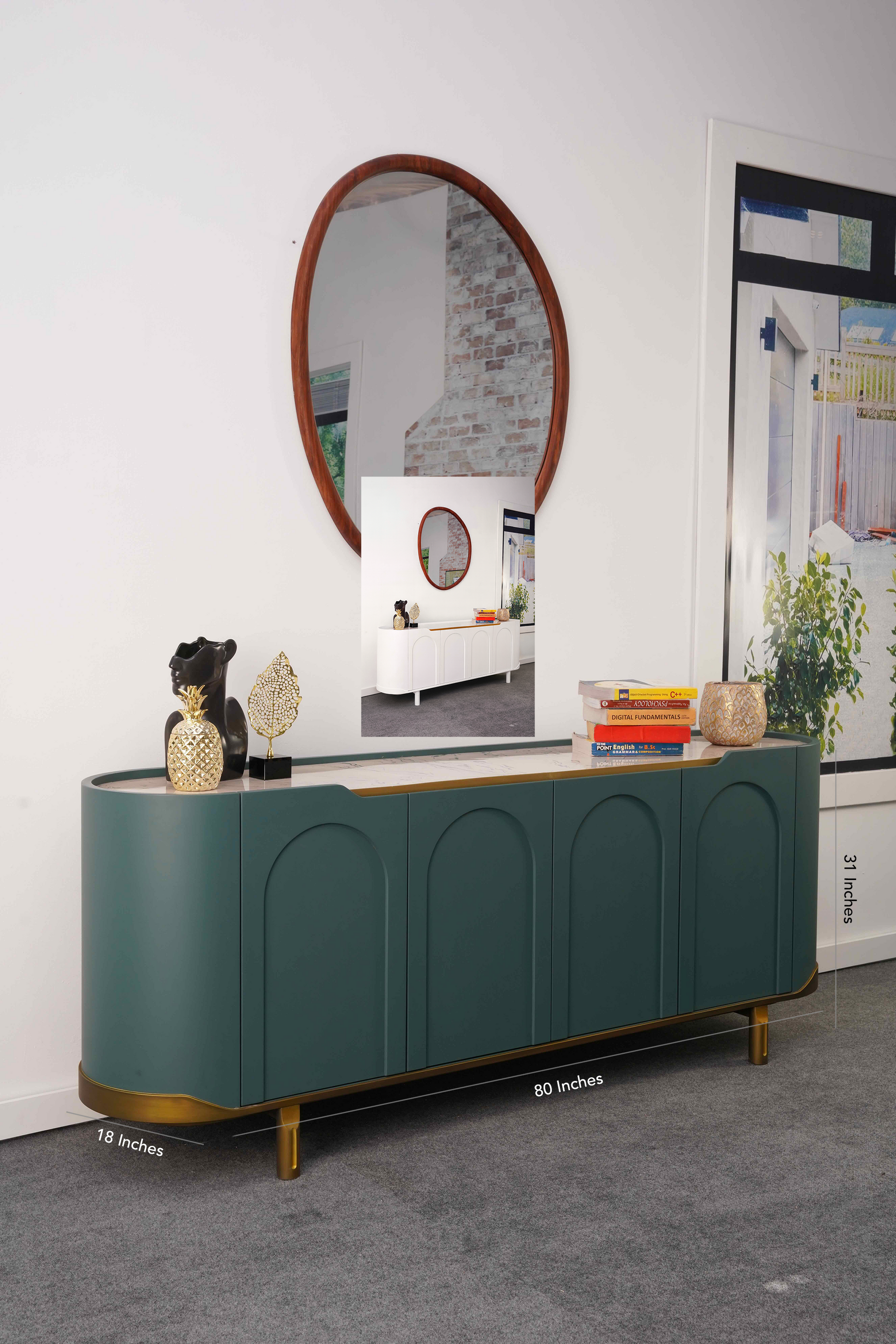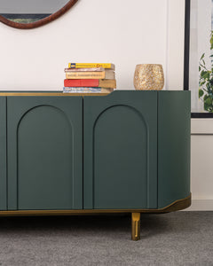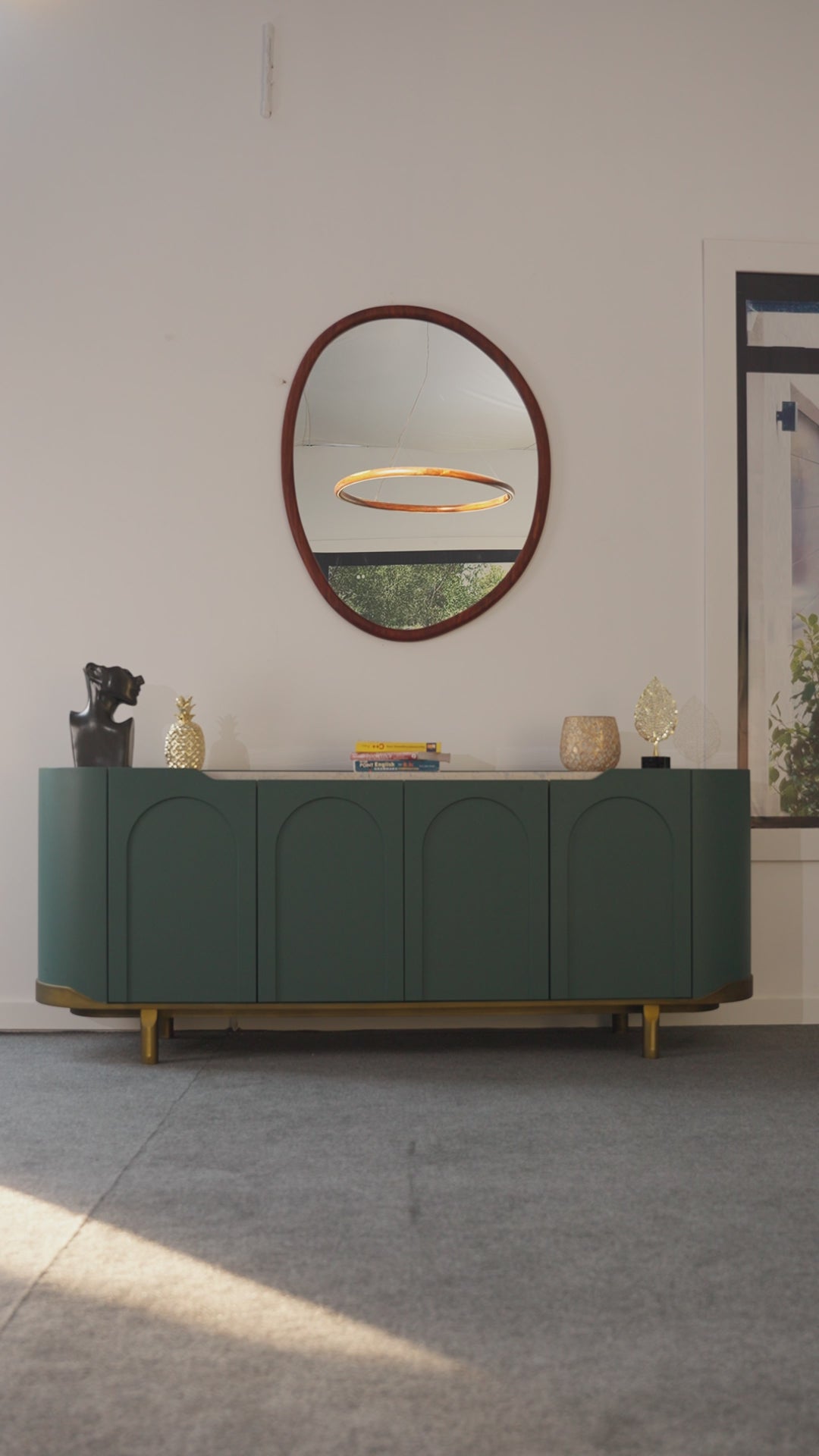 The Luna Console embodies modern sophistication with its graceful curves and architectural form. Finished in a deep, rich green and accented with warm golden details, it adds a touch of refined luxury to any interior.